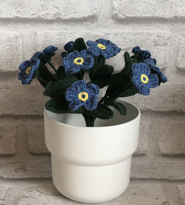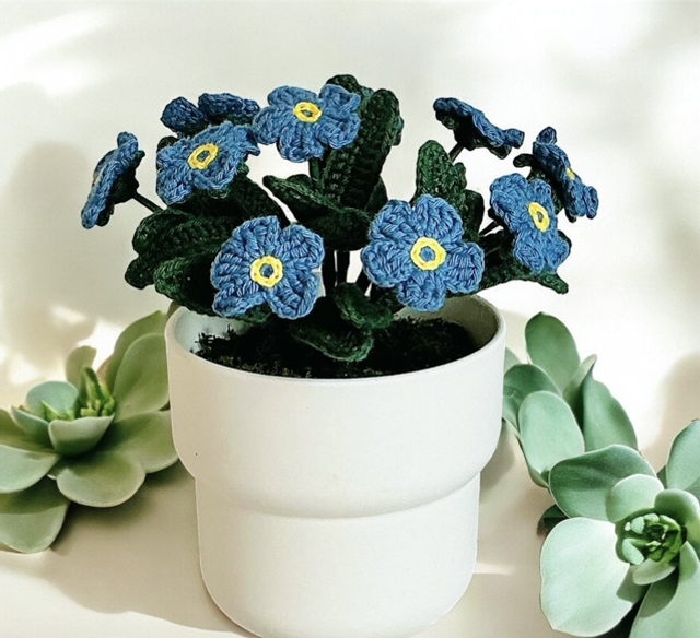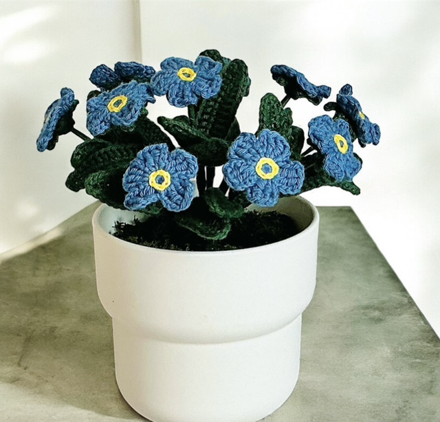 Bring a touch of charm to your home with these adorable crocheted forget-me-not flower pots! Each pot features 10 delicate forget-me-nots, crafted from 100% cotton yarn in a pretty denim blue with sunny yellow centers. Lush green leaves and sepals, also made from cotton yarn, add a touch of realism and are shaped with florist wire for a natural look. At a petite 10cm high and 10cm wide, these forget-me-nots are perfect for adding a pop of color to any sunny windowsill or desk.